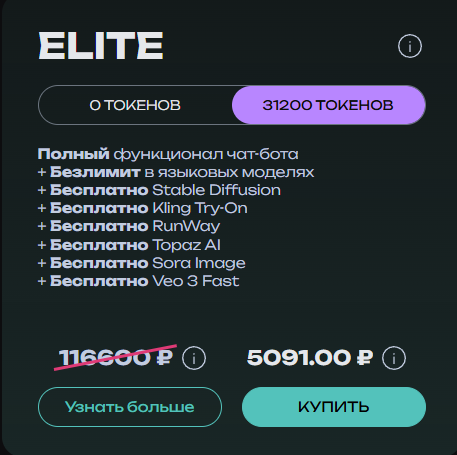 - Elite: Безлимитная генерация видео с Veo 3 Fast, доступ к 50+ моделям (ChatGPT, Midjourney, ElevenLabs). Подходит для соло-креаторов, создающих 100+ видео в месяц.
