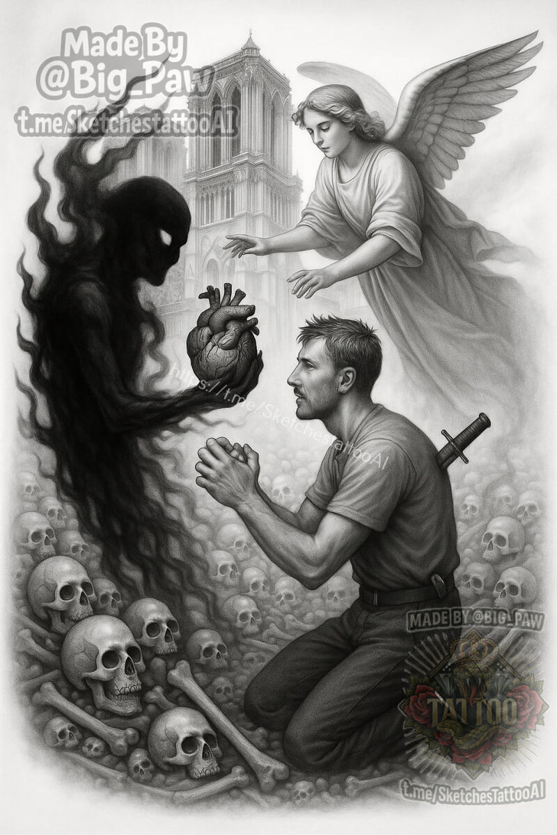 #2746 Подборка по запросу подписчика - сделать подборку эскизов на всю спину:человек с ножом в спине,борется со злой тенью,которая в руке держит человеческое сердце. За спиной человека стоит ангел хранитель. Под ногами человека кости и черепа. А на фоне собор парижской богоматери. Эскиз в стиле реализм,большая детализация. 😎 Как я и писал это сложный запрос для нейронки, много деталей, сложная перспектива и противоречия вроде "борется со злой тенью,которая в руке держит человеческое сердце" тут надо каждый кусок генерировать отдельно и потом собирать. Нейронка тупо не понимает как всю это адекватно расположить в пространстве, да ещё и с мелкими деталями за один раз. 🧠 SYNTX - создай свой эскиз 💎 Информация - все услуги 💀 Эскизы от нейросети #наспину #ангел #реализм #эскиз #тату #татуировка