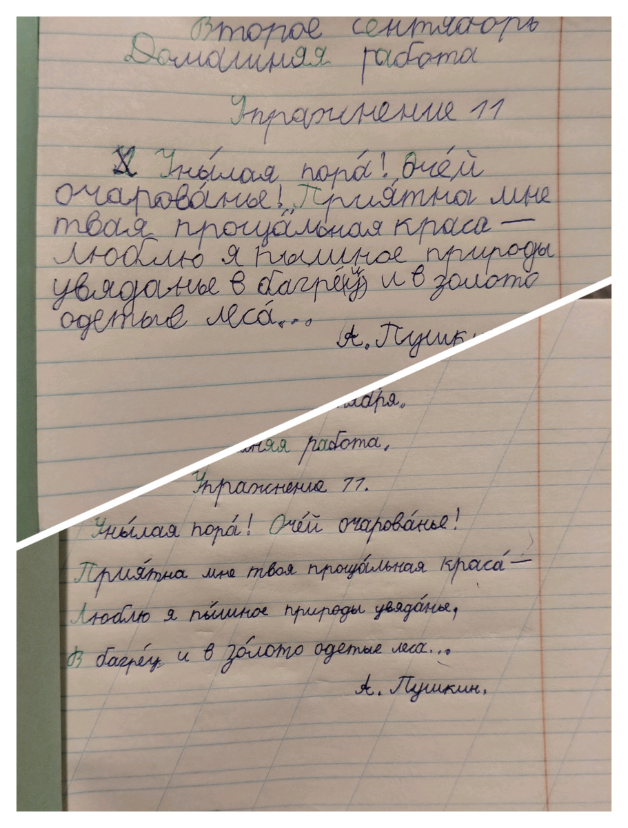 На самом деле, одну работу ребенок делал в спешке, чтобы успеть до нудной матери, а другую – с этой самой - нудной, дотошной, приставучей, прилипучей, не отстающей ни при каких обстоятельствах (не помогли даже истерика и ультиматумы типа «Да я завтра ваще никуда не пойду!» или «Да я вообще брошу школу!») матерью. Даааа, входить в режим домашних заданий тяжело. Особенно мне. Я так люблю вечерами отдыхать и ничего не делать, и уж тем более не трепать нервы… После уговоров, угроз и снова уговоров, русский был переписан – аккуратно (даже чересчур), безошибочно (даже беспомарочно), идеально (даже для любой девочки, я так считаю)))))). Что хочется пожелать родителям? Терпения! И помните, что дети это наше отражение. Но об этом я напишу как-нибудь в другой раз)