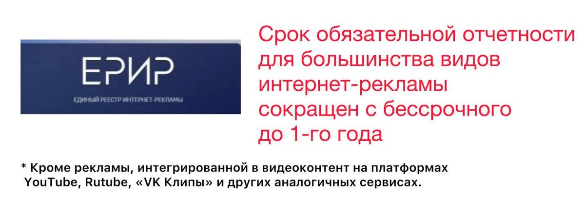 Решение сохранить бессрочную отчетность для видеорекламы, предположительно, связано с особенностью работы рекомендательных алгоритмов. Платформы могут показывать пользователям видеоролики многолетней давности, что приравнивается к фактическому распространению рекламы.