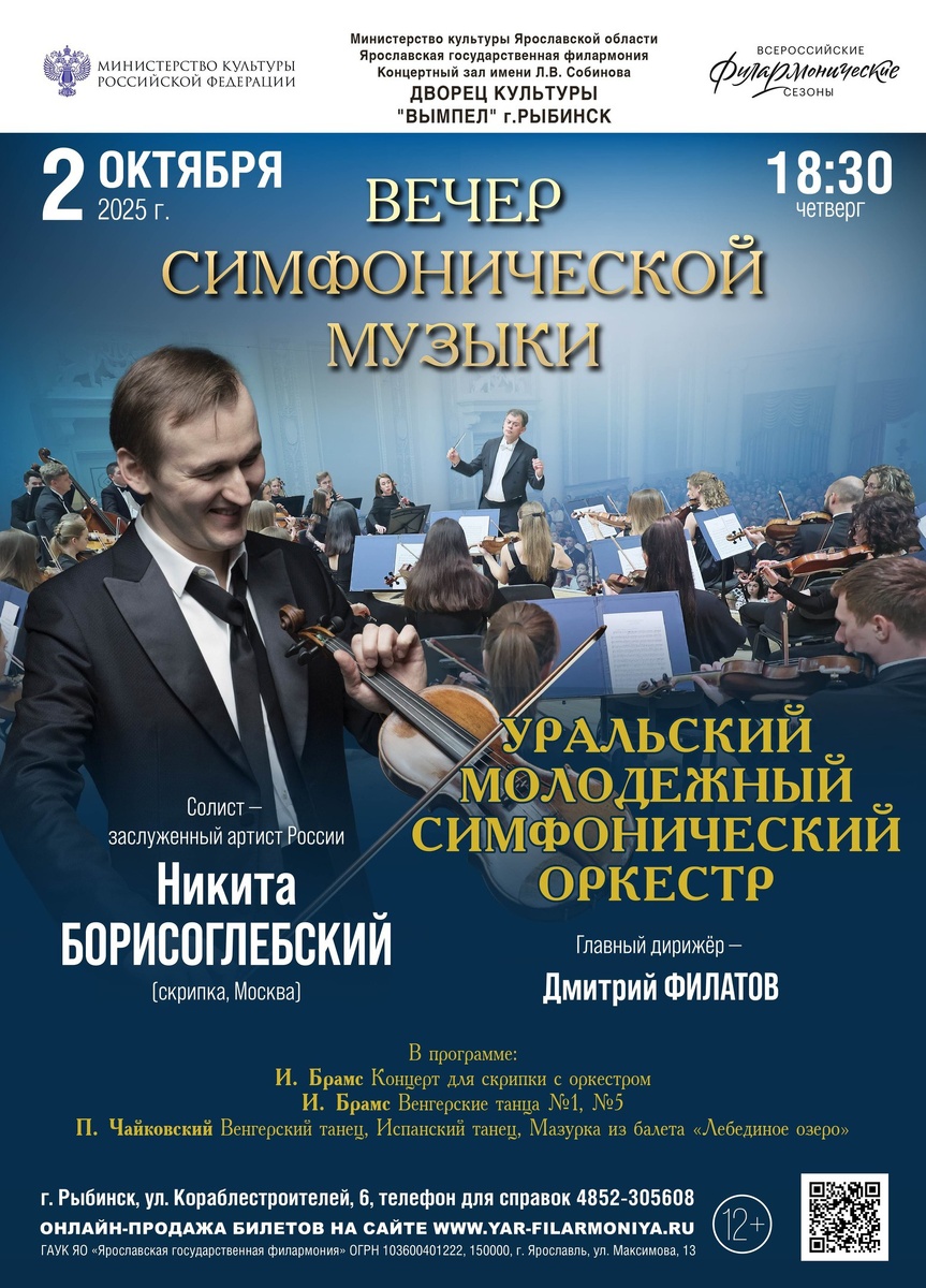 Музыкальный праздник в Рыбинске! 📢 2 октября 2025 года, в 18:30, Дворец культуры «Вымпел» распахнет свои двери для незабываемого вечера классической музыки. На сцене выступит прославленный Уральский молодёжный симфонический оркестр под руководством своего главного дирижёра Дмитрия Филатова. 👏👏👏 В этот вечер вас ждет встреча с настоящей звездой – заслуженным артистом России, скрипачом Никитой Борисоглебским (Москва). 👏👏👏 Его виртуозная игра, отмеченная победами на престижнейших международных конкурсах, покорила сердца слушателей по всему миру. 🎶 Программа концерта обещает быть захватывающей: прозвучат страстные Венгерские танцы №1 и №5, а также Концерт для скрипки с оркестром И. Брамса. А для полного погружения в волшебный мир балета, оркестр исполнит Венгерский танец, Испанский танец и Мазурку из знаменитого «Лебединого озера» П. Чайковского. Этот концерт – особенное событие, организованное в рамках программы Министерства культуры РФ «Всероссийские филармонические сезоны». Он с