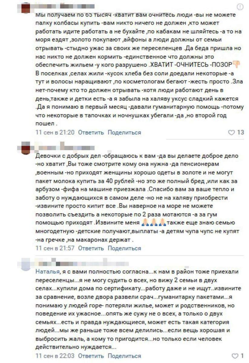 Переселенцы просят курян перестать стыдить их за выплаты и гуманитарку. Очень эмоциональное обращение поступило в редакцию "КурскСити". - Народ, по ходу мы все подзабыли, кто у нас враг и с кем мы воюем? Почему мы становимся врагами друг другу? Каждый день мы подвергаемся опасности, и мы должны поддерживать друг друга, а не чмырить пострадавших за 65 тысяч рублей, кто получает гуманитарку, а кто нет. Не все куряне понимают, что мы потеряли все, что было нажито годами, непосильным трудом - всё уничтожено! Мы остались по факту без ничего! Хочу задать вопрос жителям города, которые возмущаются тому, что нам помогают: скажите, пожалуйста, вы готовы потерять своё жильё и жить на 65 тысяч рублей, как это делаем мы? Если готовы, напишите адрес, я с радостью поменяюсь с вами местами, буду жить в квартире и отдавать вам 65 тысяч в месяц, - написала нам в бот жительница курского приграничья. Свое обращение она сопроводила скриншотами с нелестными комментариями о переселенцах в соцсетях. Наприме