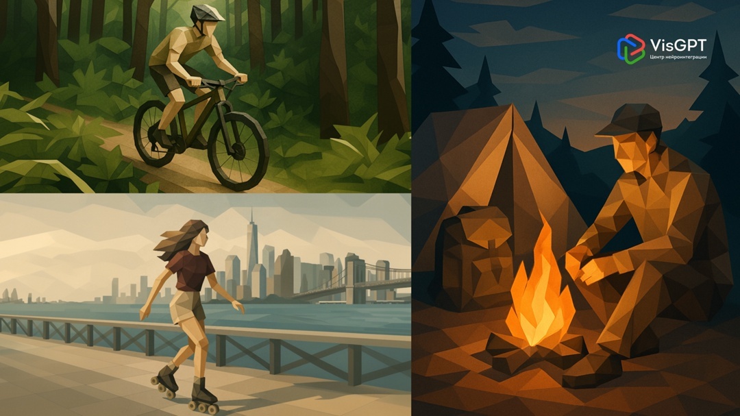Яркая low-poly иллюстрация в стиле современного минимализма, словно оригами. В центре — [ОПИСАНИЕ ДЕЙСТВИЯ, например: "спортсмен, совершающий восхождение в горы"]. Персонаж в динамичной позе, облаченный в [ОПИСАНИЕ И ЦВЕТ ОДЕЖДЫ]. Характерные угловатые, фасетированные формы с мягкими градиентами. Теплое, атмосферное освещение "золотого часа". Фон — стилизованные геометрические элементы [ОПИСАНИЕ ЛАНДШАФТА: горы, природа, парк] с силуэтами в [ЦВЕТОВАЯ ПАЛИТРА]. Эффектный векторный дизайн с чистой композицией, подчеркивающей объем. Основной мотив — активный отдых и единение с природой.