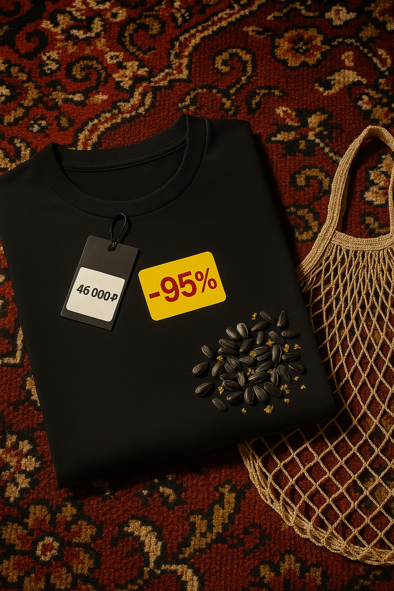 В моде всегда есть детали, которые превращаются в символы. Раньше это были мех и бриллианты, сегодня — семечки, ковёр и авоська. Поменялись ценности, люди устали от стерильных бутиков, одинаковых кампейнов и безупречных витрин. Они ищут реальность, не вычищенную, а прожитую. И именно поэтому бытовое стало новым языком стиля. Авоська - это аксессуар, который свободно вписывается и в подиум, и в маркетплейс, в ней можно нести хлеб и футболку из новой коллекции. Семечки — ещё один пример. В руках на лавочке — символ обыденности, руках модели в футболке с ценником 46 000 ₽ — это уже комментарий о роскоши, которая не боится иронии. Семки становятся тем же самым, чем когда-то были сигары: символом состоятельности. Ковёр — вообще отдельная глава, в советских квартирах он был фоном для семейных фотографий, сегодня — это подиум и арт-объект. Его цвет, рисунок и «бытовая память» превращают его в поверхность, на которой люкс смотрится сильнее, чем на мраморе. Новый люкс строится на этом контраст