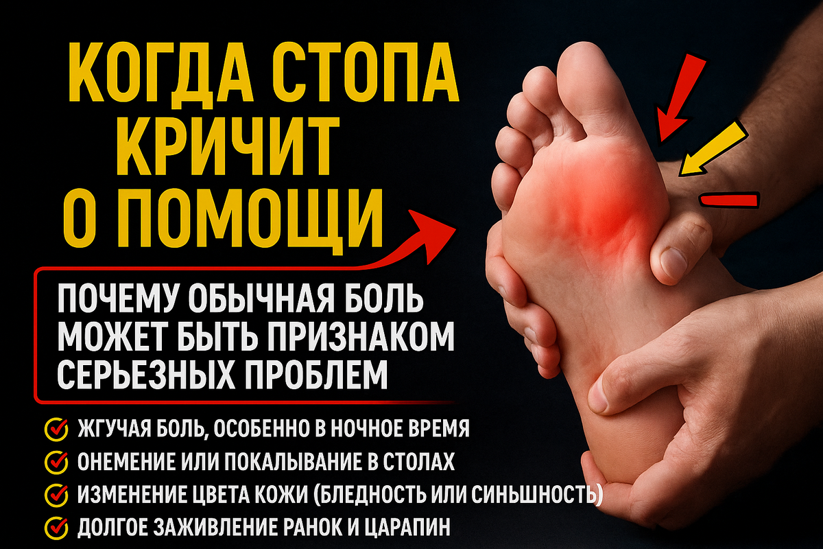 Боль в стопе — это не всегда признак смертельной болезни. Часто она действительно вызвана усталостью, перенапряжением или неудобной обувью. Но иногда именно стопа первой сигнализирует о серьезных проблемах в организме — диабете, сердечно-сосудистых заболеваниях, нарушениях обмена веществ.