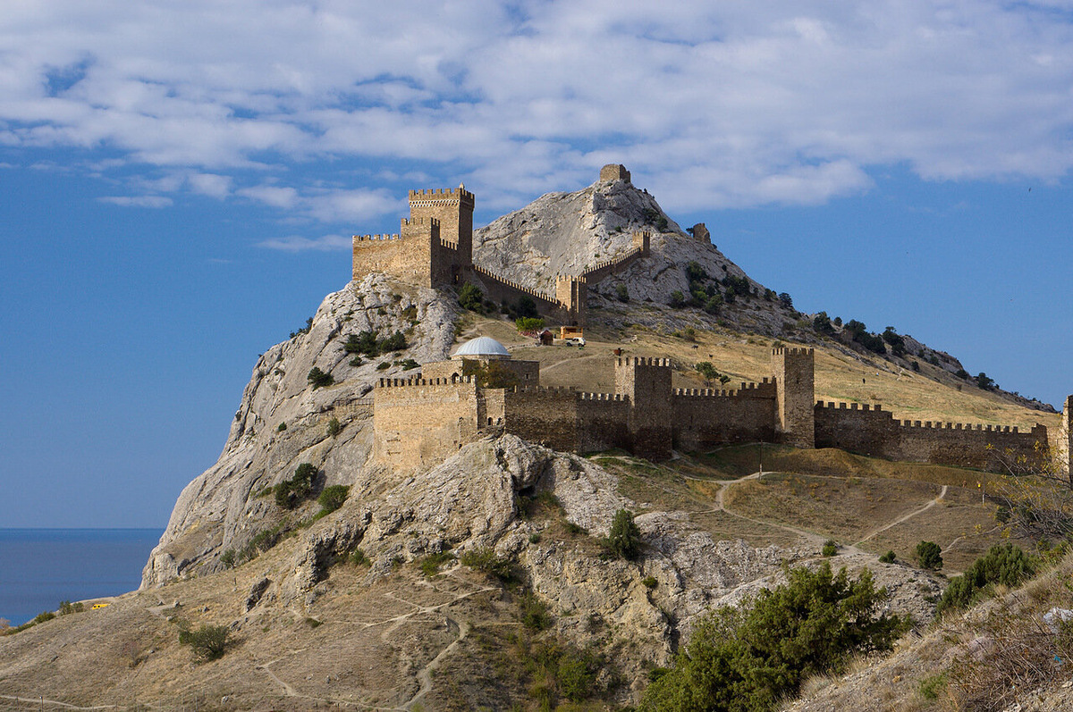 Генуэзская крепость на крутом горном склоне высотой 157 метров является древним комплексом военных укреплений в Судаке и бывшим местом главных торговых площадок средневекового византийского порта Сугдеи. Ну как мы могли не посетить этот замечательный объект культурного наследия, да ещё и с недавних времён музей-заповедник, с которого открываются головокружительные виды? Тем более, что находится он всего в 35 километрах от нашего места проживания. Тосечку тоже взяли с собой. Площадь мощной оборонительной системы составляет 29,5 га. Среди архитектурных сооружений X-XV веков здесь сохранились Консульский замок, мечеть, Храм Двенадцати апостолов, развалины католического собора Девы Марии, оборонительная стена с множеством башен, остатки городской застройки и приморские укрепления VI века. Надюша сразу незаметно смешалась с группой у которой был личный экскурсавод, чтобы напитаться полезной и познавательной информацией. За её спиной находится храм с аркадой - храм апостола Матфея, Падишах-