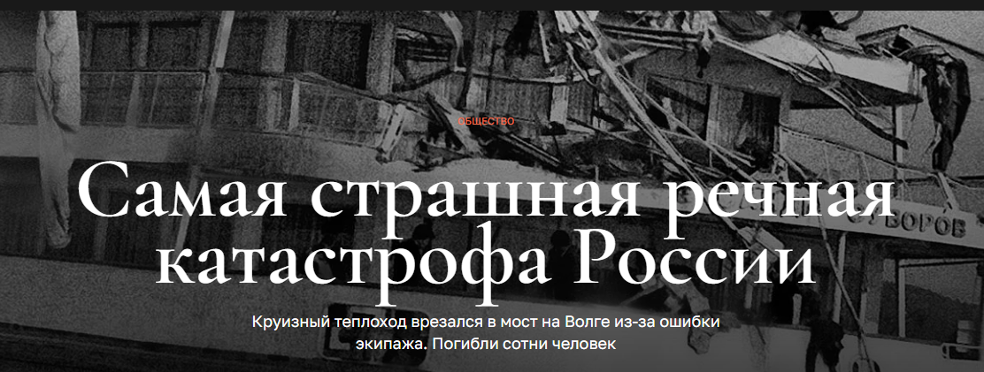 5 июня 1983 года новый круизный теплоход «Александр Суворов», который выполнял рейс из Ростова-на-Дону в Москву, на полном ходу врезался в пролет железнодорожного моста под Ульяновском. Верхнюю палубу срезало. По официальным данным, погибли 176 человек — больше трети пассажиров. Крушение «Суворова» стало самой крупной речной катастрофой в истории СССР и современной России. Как человеческая ошибка привела к страшной трагедии — в рубрике «Катастрофы».