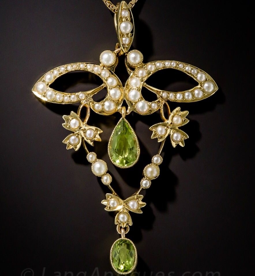 На фото украшения 1910-х годов, Российская Империя. Именно в это время демантоиды были особенно популярны, их оправляли в ажурное золото или серебро, создавая изысканные украшения в стиле модерн. Демантоиды часто сочетались с жемчугом, бриллиантами и другими драгоценными камнями, подчеркивая их неповторимую красоту.