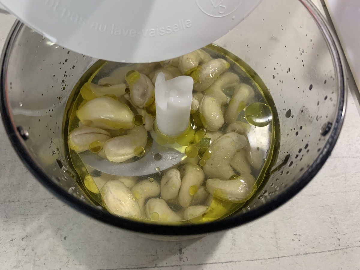 1. Кешью необходимо предварительно замочить в воде на ночь. Это сделает их мягче, и они легче будут взбиваться.