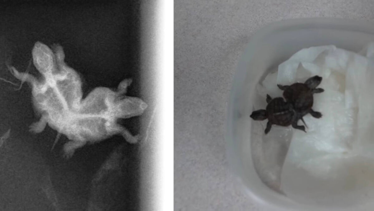 Приют Garden State Tortoise взял на передержку очень редких сиамских черепах-близнецов, которые срослись в тазовой области. В дикой природе они бы скорее всего не выжили. Назвали черепах Хип и Хоп. В ролике можно посмотреть, как проходил их первый осмотр у ветеринара. На рентгене, например, видно, какие органы у них общие.
