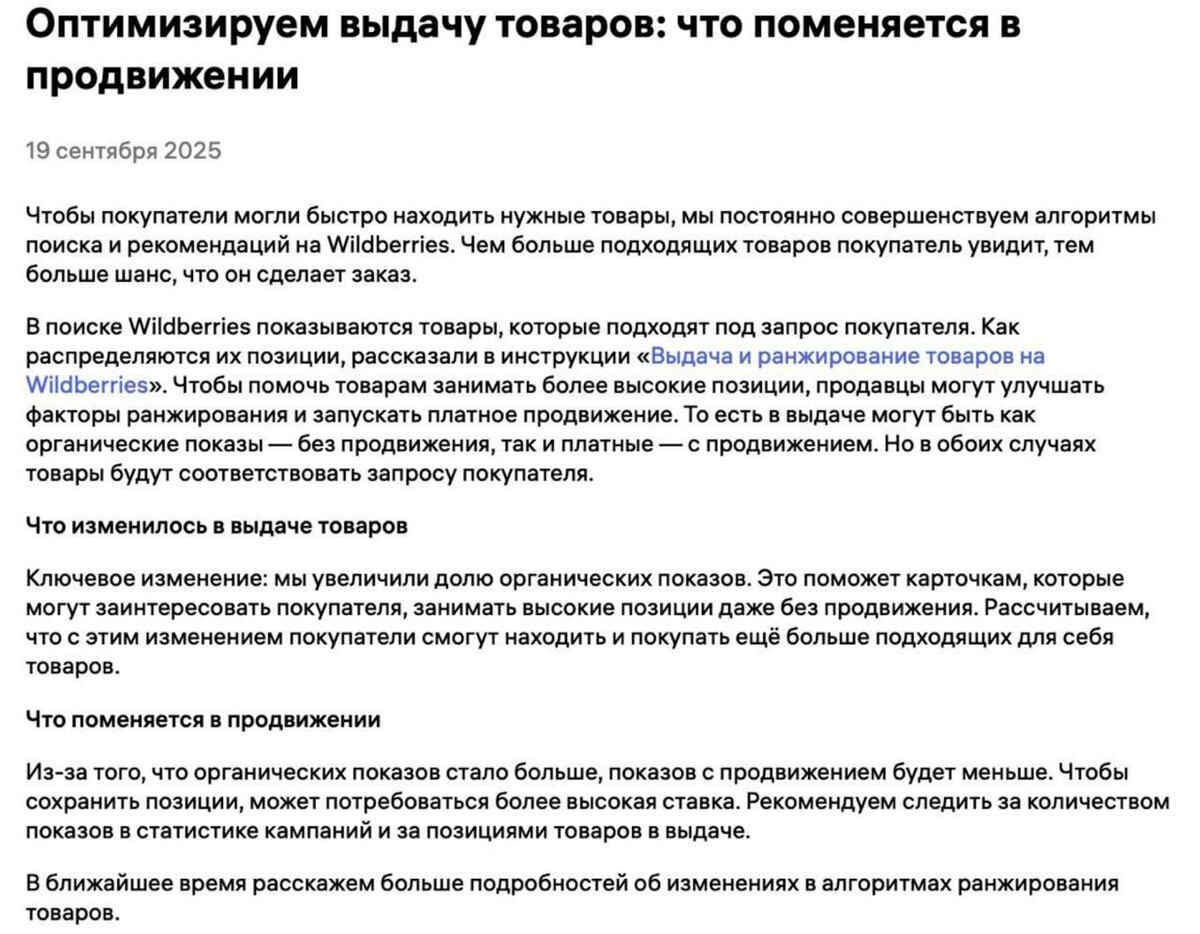 🚀 Новые правила ранжирования на WB: органика снова ⚡️🚀 Друзья, официально подтвердились изменения в выдаче и продвижении на Wildberries. Теперь ситуация стала куда интереснее - делюсь выводами и прогнозами. 🔑 Что изменилось в выдаче Теперь 50–70% мест в ТОПе занимают органические карточки. Это значит, что хорошо проработанные карточки могут выйти в топ без вложений в рекламу. Покупатели получают более релевантные предложения, а селлеры с СУПЕР товарами - бесплатный трафик. По сути, WB делает ставку на качество: кто умеет создавать карточки, реально продающие сами по себе, тот и будет собирать 🍋. 📉 Что изменилось в продвижении Мест для рекламы стало в 2 раза меньше, но их стоимость - в 2 раза выше. Чтобы сохранить позиции через продвижение, придётся повышать ставки. Но: даже если «залить» бюджетом слабую карточку, она в органике всё равно не закрепится. В итоге рекламодатель рискует слить бюджет. ⚖️ Ключевые выводы для селлеров Фокус только на супер-карточке. Фото, описание, о