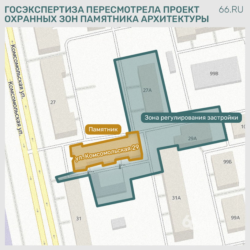 Региональным объектом культурного наследия здание на Комсомольской, 29 признали три года назад. Это двухэтажный «Жилой дом с магазином и детсадом» в стиле неоклассицизма, построенный в 1951 году. Возводить рядом с памятником здания выше 12 метров не разрешали. В зоне регулирования застройки, установленной прежней экспертизой, находились два соседних дома на Комсомольской, 31 и 31А. Один высотой два этажа, другой — пять. Теперь площадь зоны сократили на 1,2 тыс. кв. метров, и эти дома в нее не попадают. На их месте девелоперы могут развернуть многоэтажное строительство. Район улиц Комсомольская-Технологическая-Студенческая-Первомайская, где находится здание-памятник, относят к неэффективным жилым территориям. Раньше этот квартал предлагали включить в программу комплексного развития территорий (КРТ), но в городской администрации 66.RU сообщили, что сейчас таких планов нет. Желающим построить что-нибудь на месте существующих домов придется покупать квартиры у их жителей.