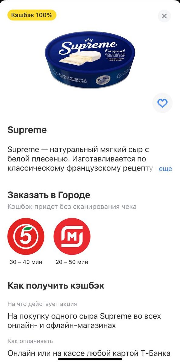 100% кэшбек в Т-банке. Проверьте приложение - сегодня вернут 100% за покупку мягкого сыра с плесенью Supreme, который можно купить во всех онлайн и офлайн магазинах. Не забудьте загрузить чек. Максимум возвращают 350 баллов.