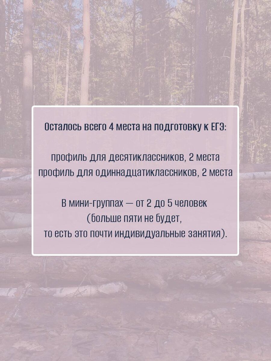 Осталось всего 4 места на подготовку к ЕГЭ: 📘 профиль для десятиклассников, 2 места 📕 профиль для одиннадцатиклассников, 2 места ‼️ Одиннадцатиклассники, очень советую поторопиться и записаться, иначе потом будет поздно. Да, ко мне приходили и позже... Но это потребует титанических усилий. А если запишитесь сейчас — начинаем заниматься, и раскачка пойдёт уже в процессе, без потери полугода. Как проходят занятия? 👩🏫 В мини-группах — от 2 до 5 человек (больше пяти не будет, то есть это почти индивидуальные занятия). Между занятиями есть задания 📝, которые нужно обязательно выполнять. Ведь мы работаем на результат. Как долго длится занятие и сколько раз в неделю? Есть разные варианты: ✔️ по часу или по полтора ✔️ один или два раза в неделю Чтобы попасть на занятия, нужно сначала записаться на Персональную встречу 🙋. Там мы определим Ваш уровень, уточним цель занятий и подберем подходящую мини-группу. 👉 Записывайтесь по ссылке!