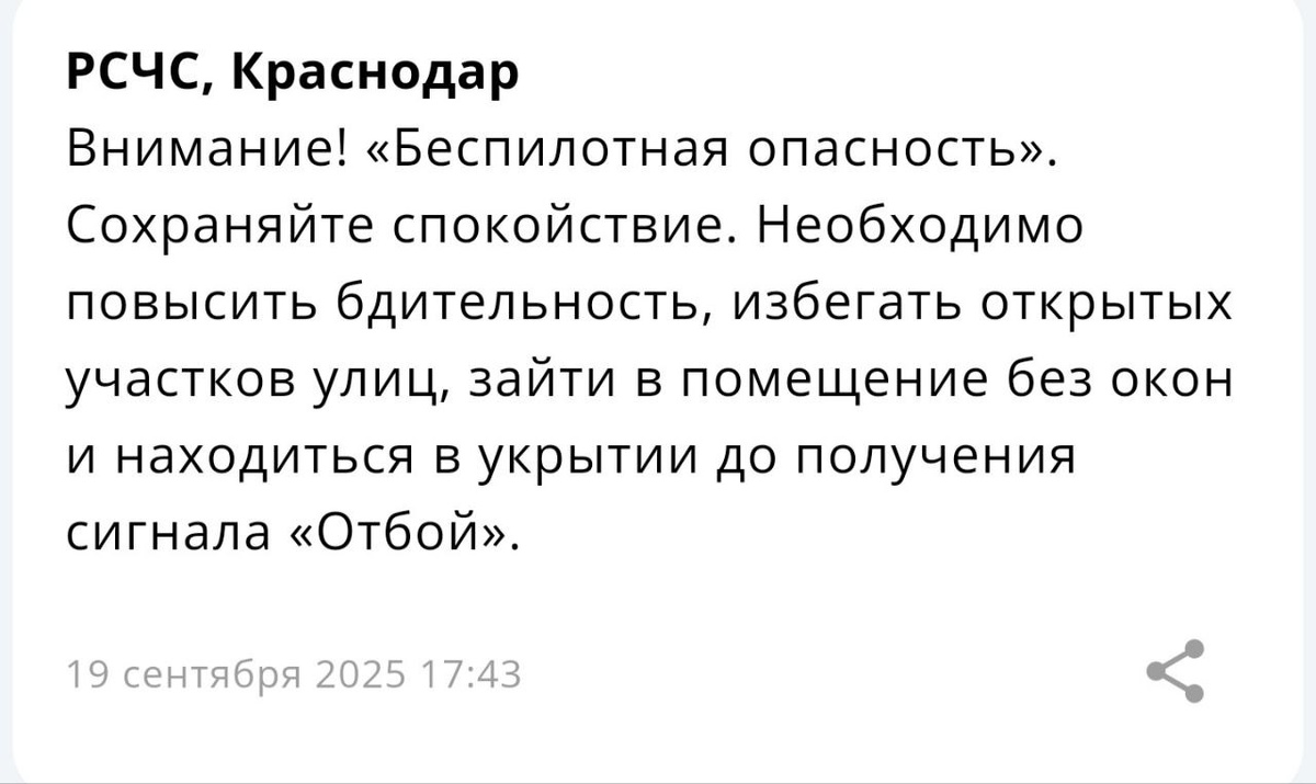 На территории Краснодара и края объявлена «Беспилотная опасность».
