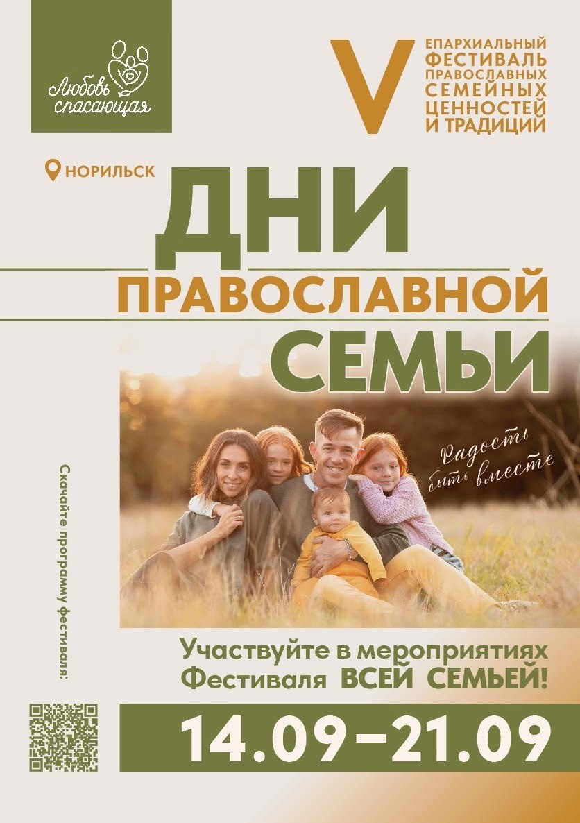 Фестиваль приурочен ко дню памяти благоверных Петра и Февронии, Муромских чудотворцев. В этом году основные мероприятия фестиваля состоятся с 14 по 21 сентября, в ходе которых в Норильске проходят «Дни православной семьи», включающие проведение секций, мастер-классов, кинолекториев, семейных встреч и круглых столов. В рамках фестиваля будет показан фильм Даниила Щипкова о служении военных священников «Бог на войне».