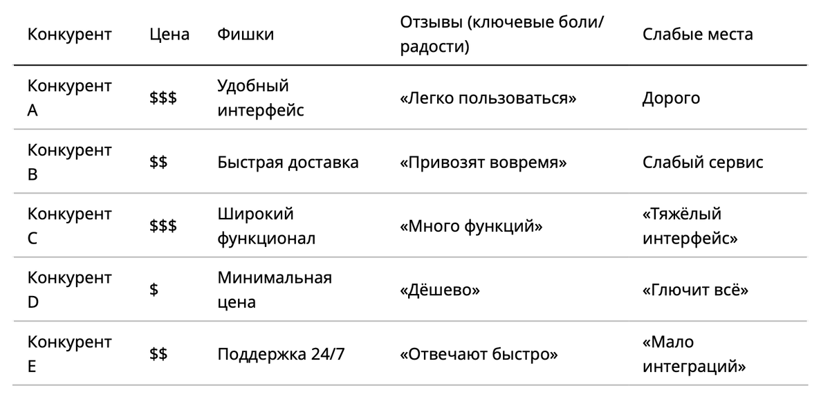 SaaS для автоматизации закупок сравнил себя с топ-5 игроков. Вывод: конкуренты либо «монстры с дорогим софтом» (большие, но неповоротливые), либо «дешёвые самописки» без поддержки. Команда выбрала позицию «доступный + удобный» и откусила рынок у обоих. 🛠 Инструменты для быстрого обзора 📝 Как применить ✅ Вывод