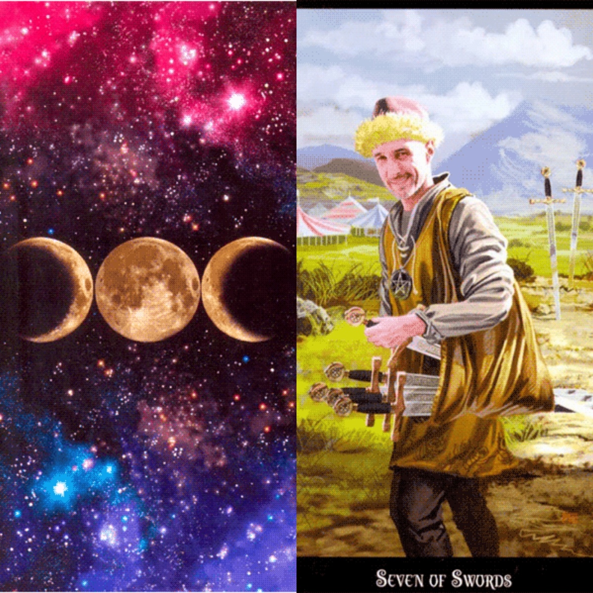 🧿КОЛДОВСКОЕ ТАРО 🧿СЕМЕРКА МЕЧЕЙ Мужчина, хитро улыбаясь, уносит с поля пять украденных мечей. Он оставил на поле ещё два меча, весьма довольный тем, что ему досталось. Мужчина одет в золотисто – жёлтую тунику, низ которой украшен узором в виде воздушных перьев. На его шее висит кулон в виде пентакля. Мужчина едва сдерживается, чтобы не засмеяться вслух от радости. Он добился своего и избежал противодействия, воспользовавшись своей «уличной» мудростью, ловкостью и знаниями. На заднем плане быстро проплывают грозовые тучи, а вдалеке виднеются красочные праздничные палатки. Возможно, люди собрались на организованную там ярмарку, и мужчина воспользовался представившейся ему возможностью. Флаги над палатками развиваются на ветру в то время как буря и хитрый мужчина покидают эту местность. Все черты, связанные с элементом воздуха и мастью мечей, такие как интеллект, хитрость и дальновидность продемонстрированы на этой карте. КЛЮЧЕВЫЕ СЛОВА: Новые схемы и новые решения. Нестандартное мышл