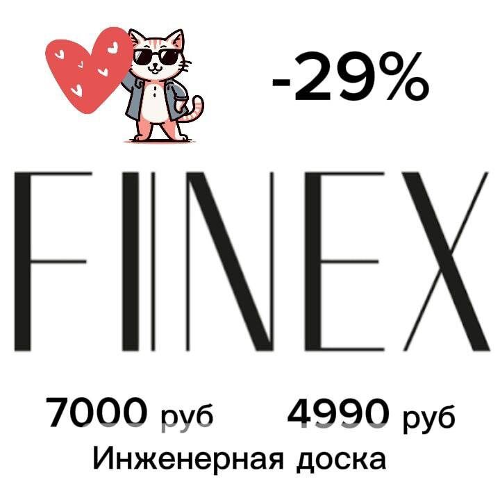 Акция на топовую инженерную доску Finex! -29% 🔥 Толщина 13,5 мм Верхний шпон - 4мм дуб Ширина - 180 мм Селекция - рустик P.s кстати, звезды российской эстрады выбирают именно этот пол! Самое время приобрести натуральный пол выгодно! Выбирай свой дизайн и мы тебе его просчитаем 👇🏻