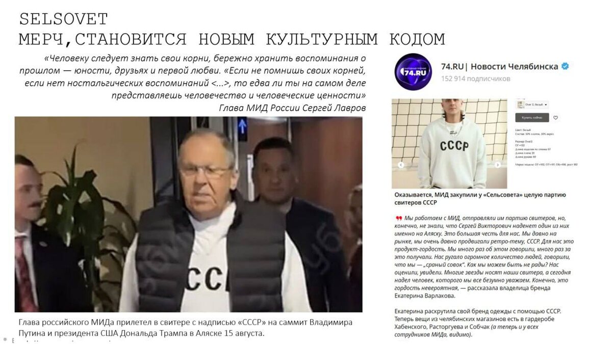 Широкую известность бренд получил после того, как Сергей Лавров прибыл на переговоры с США на Аляске в свитере с надписью «СССР» от челябинского SelSovet.