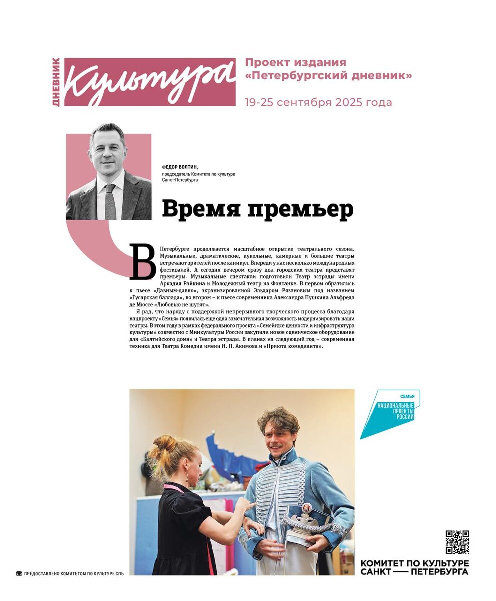 🎭 А вы уже прочитали Культурную вкладку «Петербургского дневника»? Председатель Комитета по культуре Санкт-Петербурга Федор Болтин рассказал о ярком старте нового театрального сезона и о том, как нацпроект «Семья» помогает модернизировать наши театры. Подробности — в сегодняшнем выпуске нашей газеты. Подписаться на Петербургский Дневник в MAX