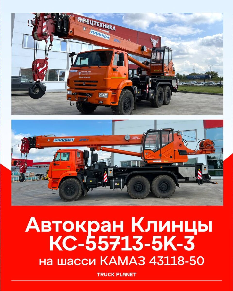 Автокран «Клинцы» КС-55713-5К-3 спроектирован для ритмичной работы на строительных и промышленных площадках. Конфигурация на полноприводном шасси обеспечивает подъезд к зоне работ, телескопическая стрела дает доступ к точкам за препятствиями, а круговая зона работы 360° позволяет планировать подачу элементов без лишних перестановок. За счет понятной кинематики и предсказуемой грузовой диаграммы модель подходит для типовых операций — от монтажа металлоконструкций и ЖБИ до точной установки технологического оборудования. Основные характеристики: ▪️ Грузоподъемность — 25 т ▪️Грузовой момент — 80 тм ▪️ Длина телескопической стрелы — 28 м ▪️Зона работы — 360° ▪️Базовое шасси — КАМАЗ-43118 (6×6) ▪️ Опционально: гусек 9 м (углы 0°/20°/40°) 📍Наш адрес: г. Набережные Челны, ул. Металлургическая, д. 97. Для записи на встречу в офисе, консультации или приобретения техники свяжитесь с нами: — 8 (800) 550-43-16 (бесплатно по России) — info@truck-planet.com — Форма обратной связи на сайт