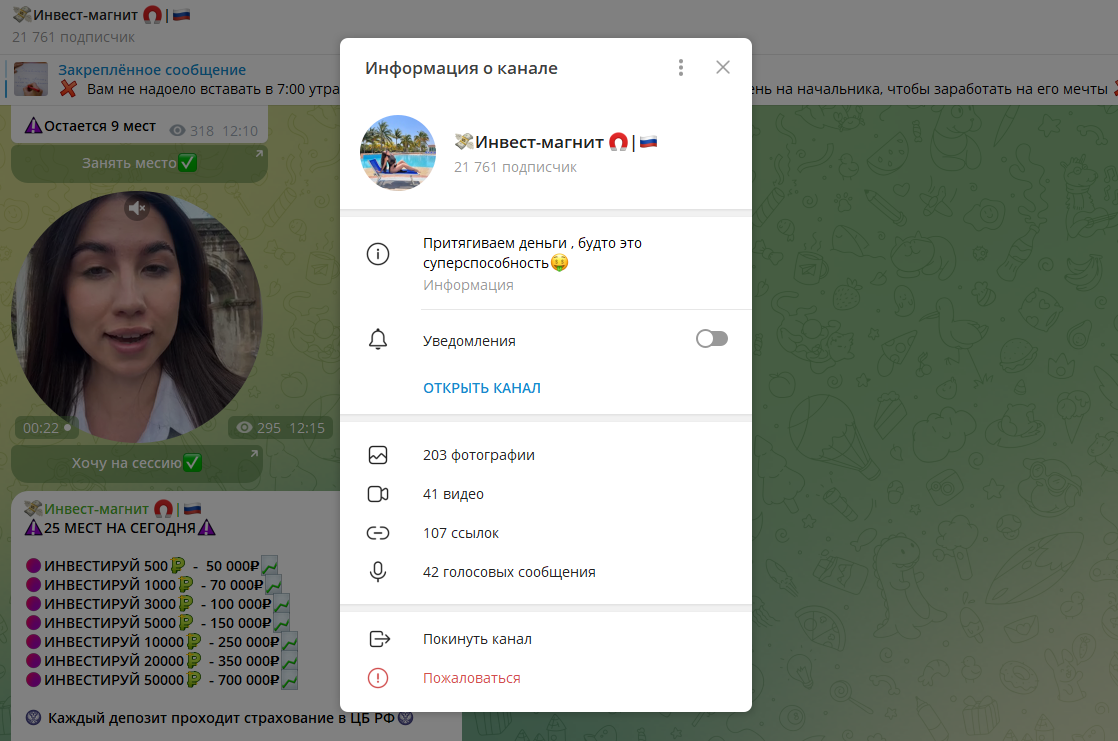 Телеграм-канал Инвест-магнит обещает быстрый и лёгкий доход через вложения в криптовалюту и токены. Его админ, представляющаяся Валерией, позиционирует себя как опытного трейдера с многолетней практикой. Однако проверка показала: реальных доказательств её компетентности нет, а схема работы канала вызывает серьёзные сомнения. ✅ Если не хотите попасть в ловушку лжеинвесторов, ознакомьтесь с проверенным проектом. Канал существует с ноября 2021 года, однако активность появилась только спустя месяцы. Это указывает либо на покупку паблика с накрученными подписчиками, либо на удаление старых постов для сокрытия истории. Автором проекта является Валерия. Её биография ограничивается именем, нет информации об образовании, опыте или юридической регистрации деятельности. Тем не менее, в публикациях заявляется, что инвестиции застрахованы Центробанком — что является ложью, так как ЦБ не страхует частные проекты. Кроме того, «Инвест-магнит» уже несколько раз менял название, что типично для мошеннич