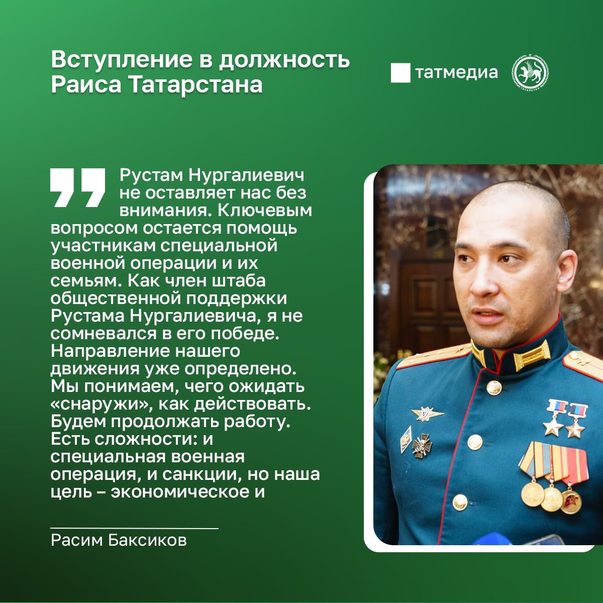 🇷🇺🪖На церемонии торжественного вступления в должность Раиса Татарстана Рустама Минниханова Расим Баксиков подчеркнул, что участникам специальной военной операции уделяется особое внимание и уважение
