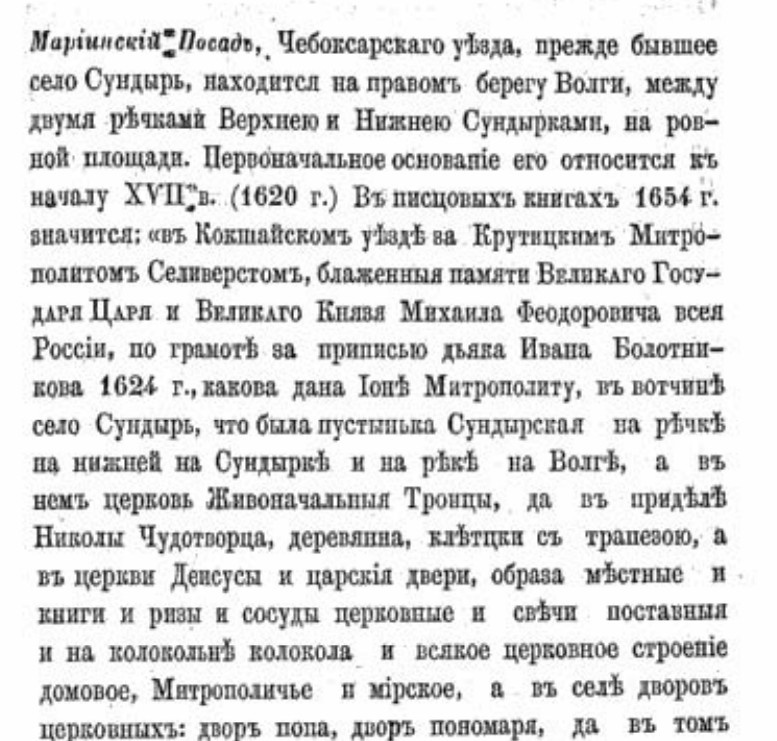 «в Кокшайском уезде за Крутицким Митрополитом Селиверстом, блаженной памяти Великого Государя Царя и Великого Князя Михаила Федоровича всея России, по грамоте за приписью дьяка Ивана Болотникова 1624 года, какова дана Ионе Митрополиту, к вотчине село Сундырь, что была пустынька Сундырская на речке на нижней Сундырке и на реке Волге,