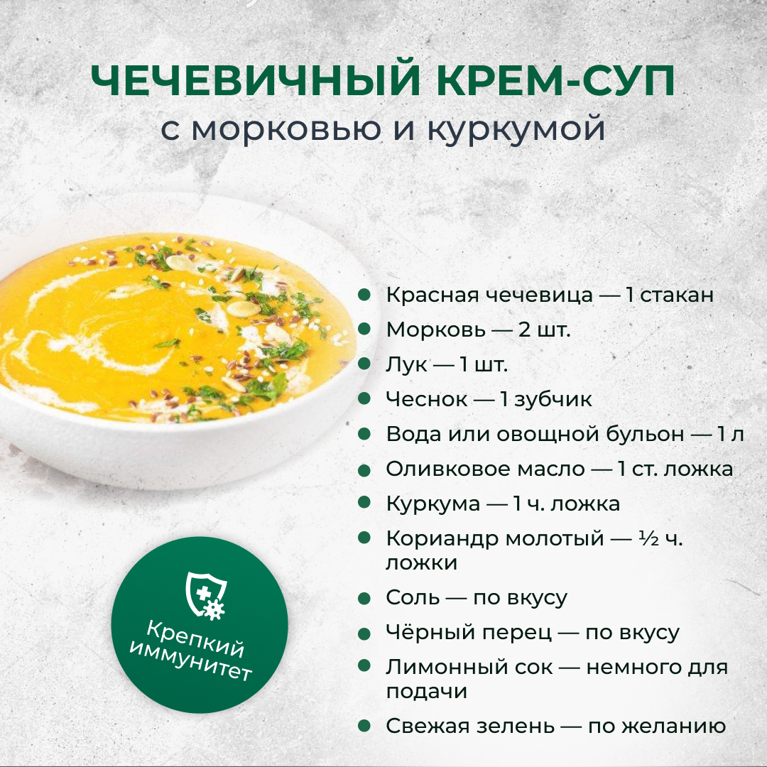 Чечевица — растительный белок + железо, куркума — мягкое противовоспалительное, а лимон освежает вкус. Этот суп легко переваривается, но надолго насыщает.