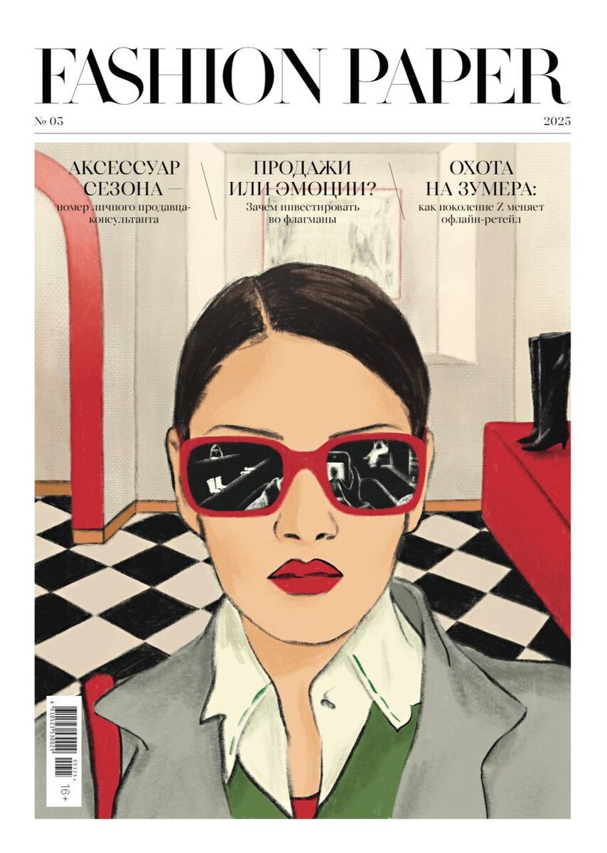 Тем временем Fashion Paper выпустил новый номер, посвящённый офлайн-ретейлу, где мода оживает не на экране, а здесь и сейчас. В нём команда издания исследует роль флагманских магазинов, силу визуального мерчендайзинга и значение продавца-консультанта, который сегодня становится проводником бренда и ключевой частью клиентского опыта. На обложке традиционно иллюстрация. На этот раз образ покупателя, как главного действующего лица офлайн-ретейла. «Иллюстрация помогла нам подчеркнуть универсальность героя, уйти от избыточной персонализации и сфокусировать внимание на деталях. В очках мы видим отражение выбора, телефон в руках намекает на поиск баланса между онлайн и офлайн. Этот приём, на мой взгляд, делает обложку более символичной. И главное, она вызывает желание ею поделиться, а значит усиливает и виральность, и продажи», — делится главный редактор Fashion Paper Александра Нечаева.