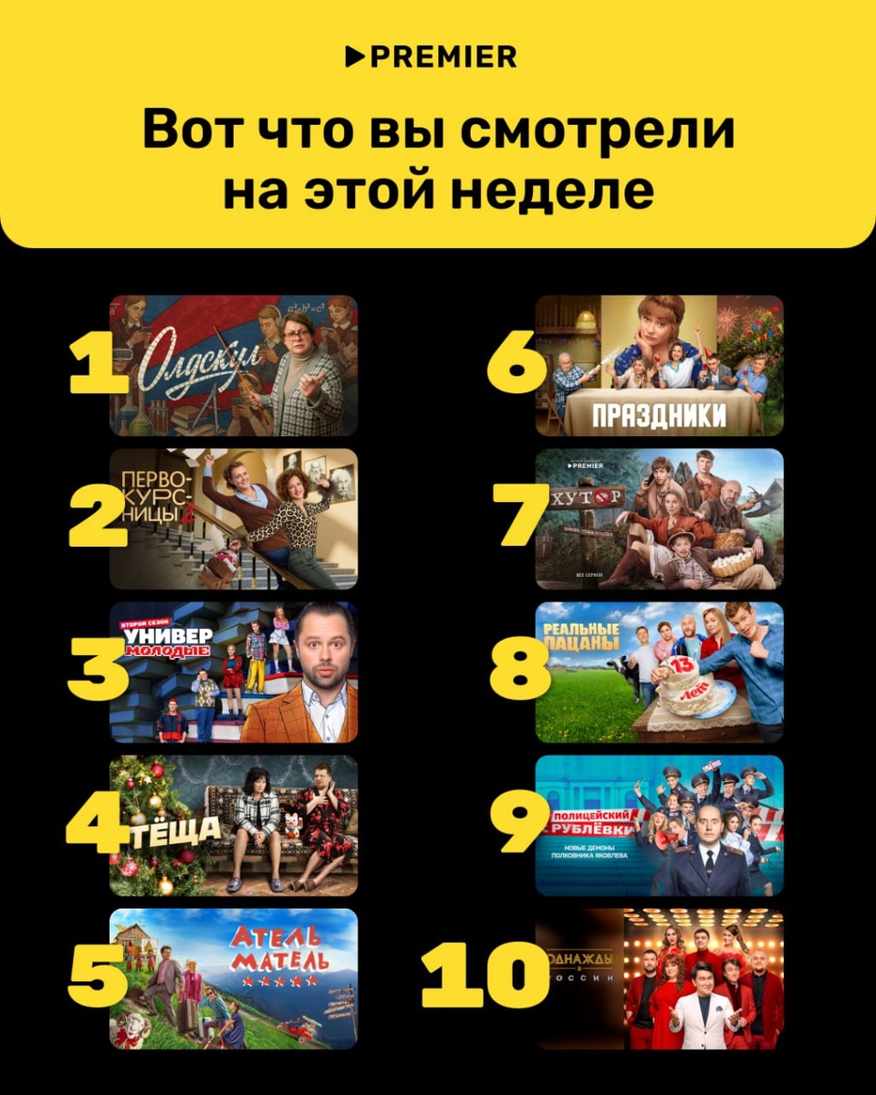 Отличники топа PREMIER на этой неделе — «Олдскул», новые сезоны «Первокурсниц» и «Универ. Молодые» 🤩 Какой новинке отдаёте предпочтение? 😕 — «Олдскул» 😭 — «Первокурсницы» 😴 — «Универ. Молодые»