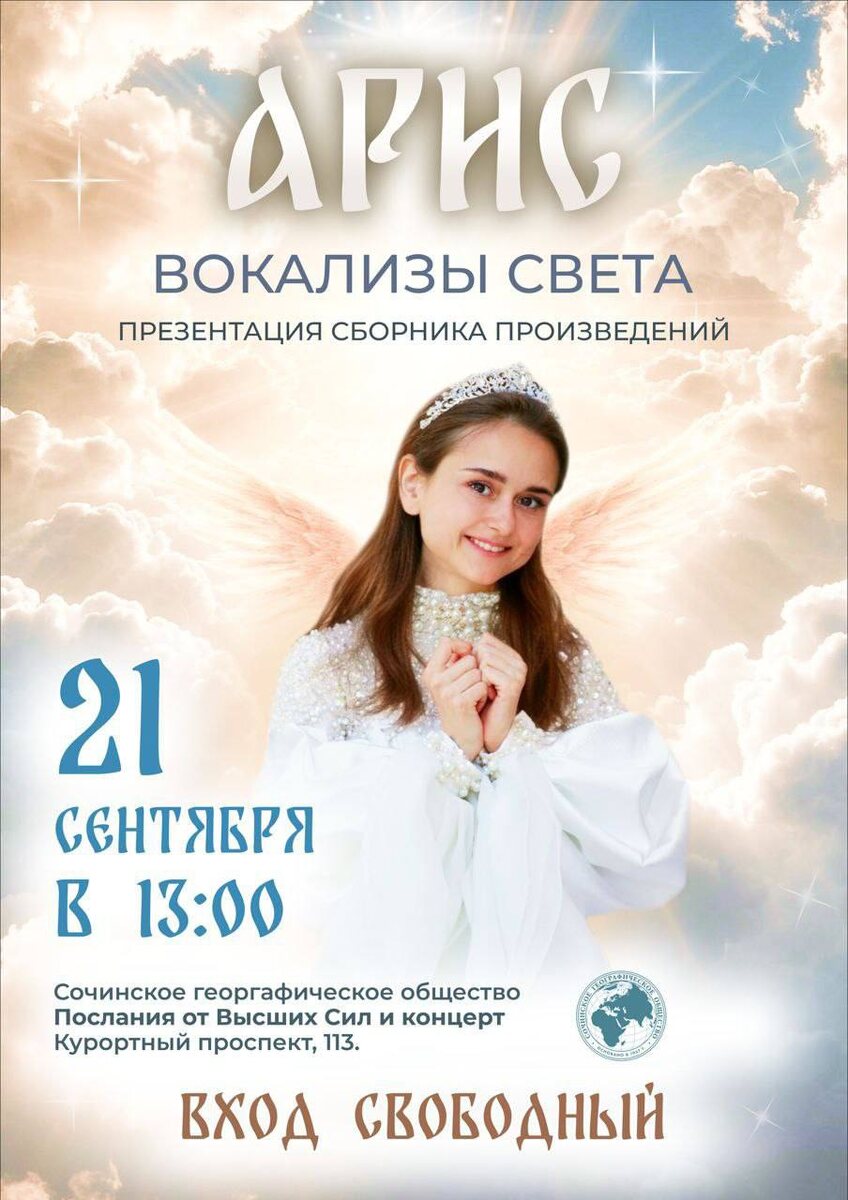 ✨ Презентация Сборника Вокализов Света Арис ✨ Высшие Силы даровали Арис уникальные Вокализы Света - музыку нового времени, которая открывает сердца, возвышает сознание и соединяет человека с вибрациями Вселенной. 🌟 В этих произведениях воплощена красота высшего бельканто: – величественная торжественность и восторженная драматургия, – масштабность фортепианной фактуры, – раскатистый диапазон голоса, – смелая гармоническая яркость терцовых модуляций. Эти вокализы - послание от Высших Сил в музыкальной форме. Их звучание обновляет клеточную память, пробуждает световую природу Души и возвращает ощущение целостности. 📍 Состоится в Русском географическом обществе 21 сентября в 13:00. ВХОД СВОБОДНЫЙ, регистрация обязательна: @LarisaMusik 🎁ПОДАРОК от Арис при встрече: Музыкантам - сборник " Вокализы Света", Всем остальным участникам - книги Арис. 🎼Прикоснитесь к музыке, которая меняет пространство и открывает двери в новые состояния.
