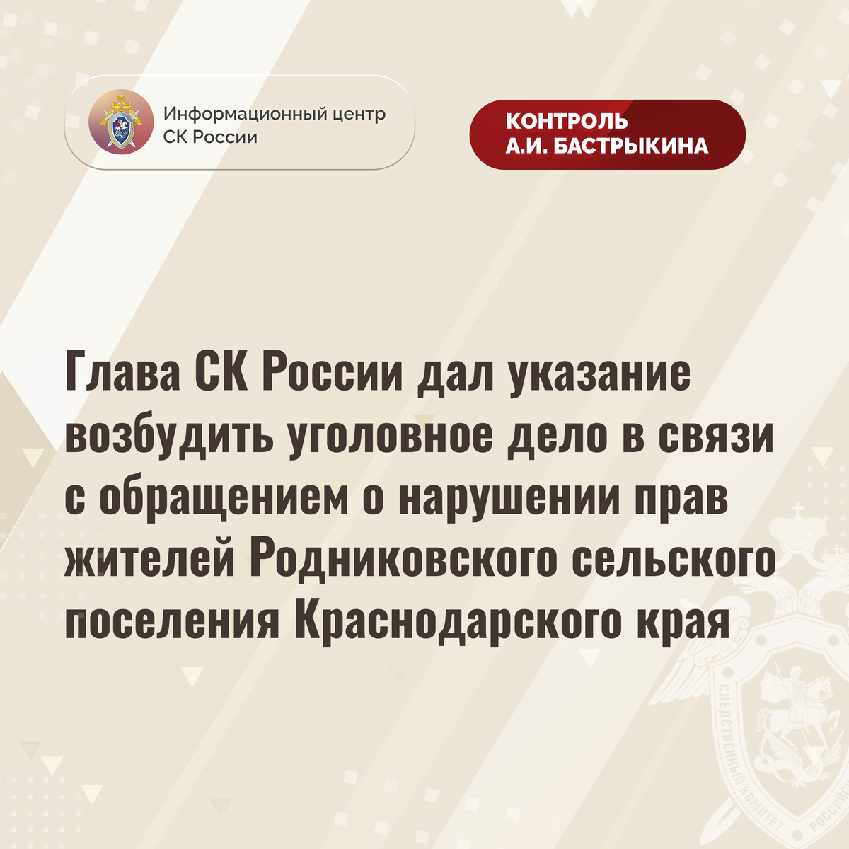 Глава СК России дал указание возбудить уголовное дело в связи с обращением о нарушении прав жителей Родниковского сельского поселения Краснодарского края В комментариях в телеграм-канале Информационного центра СК России опубликовано обращение жителей Родниковского сельского поселения Краснодарского края по вопросу нарушения их прав. На территории населенного пункта планировалась организация жилого микрорайона «Победа» и предоставление земельных участков для возведения индивидуальных жилых домов семьям погибших участников СВО, а также строительство общеобразовательной школы. В 2023 году категория назначения земель была изменена с целью передачи территории под строительство многоквартирных домов. В результате семьи лишились права получения участков. Кроме того, незаконно ограничен проезд по дороге общего пользования. Многочисленные обращения в компетентные органы результатов не принесли. В СУ СК России по Краснодарскому краю проводится процессуальная проверка. Председатель Следственного