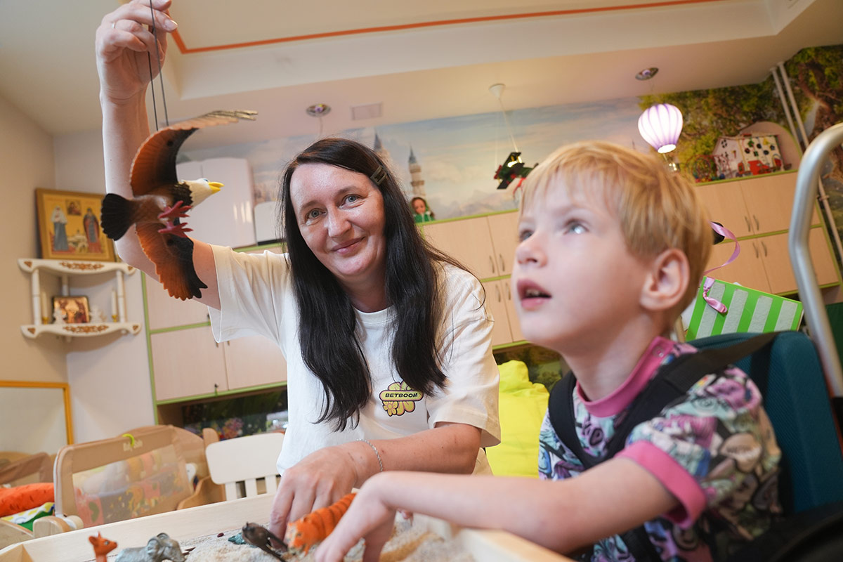 В прозрачном контейнере насыпан песок, в игрушечном мире под палящим солнцем бродят львы и тигры, мелькают быстрые ящерицы. Василиса переставляет фигурки правой рукой, левая у девочки работает хуже. И вдруг – мир пошатнулся, будет извержение вулкана! Звери начинают беспокоиться, прятаться. Василиса старательно закапывает их в песок. – Я ей говорю, давай прятать двумя ладошками, чтобы и вторая рука включалась. Игра игрой, но это тренировка возможностей ребенка, – рассказывает воспитатель Елизаветинского сада Наталья Пынько. Василисе 5 лет, у нее сложная форма ДЦП, задержка психо-речевого развития. Прогнозы врачей были неутешительны – вряд ли Васёна сможет полноценно общаться. Но она попала в особенный детский сад – Елизаветинский садик, первый в Москве центр для детей с тяжелой двигательной патологией. Это совместный проект православной службы помощи «Милосердие» и Марфо-Мариинской обители. Первые месяцы в саду были непростыми: Василиса плакала, боялась нового окружения, а ее папа всерь