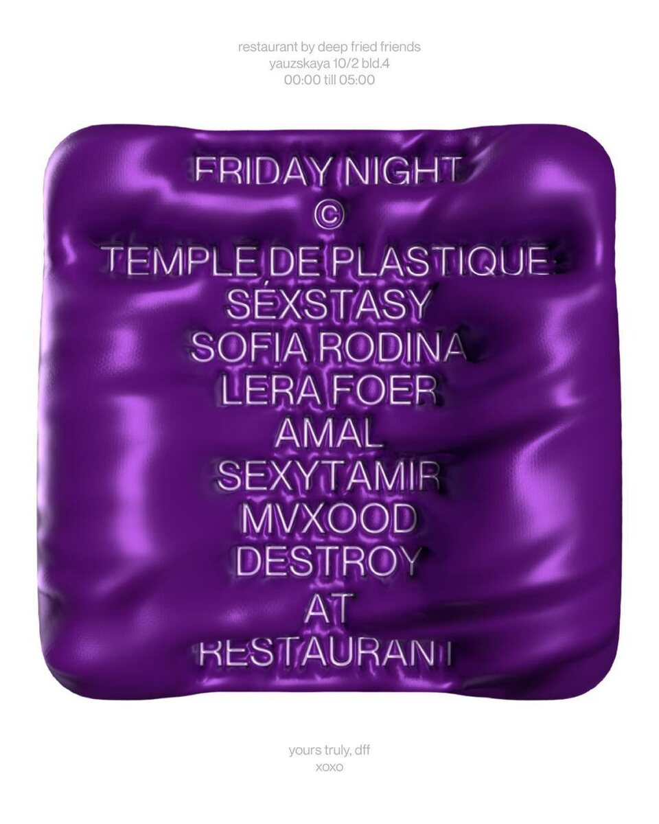 19 СЕНТЯБРЯ ⚡ TEMPLE DE PLASTIQUE AT DFF Клуб 🏛️ 00:00 MVXOOD 01:00 SEXSTASY 02:00 DESTROY 03:00 AMAL 04:00 SEXYTAMIR Двор 🏘️ 23:30 SEXYTAMIR 00:30 LERA FOER 01:30 SOFIA RODINA 🎫 — Билеты FC/DC 18+ 📆 19 сентября, в 23:30 📍 Deep Fried Friends, Москва, ул. Яузская 10/2с4