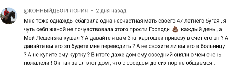 Мне тоже однажды сбагрила одна несчастная мать своего 47-летнего бугая, я чуть себя женой не почувствовала 💩«этого», прости Господи. Каждый день: «А мой Лёшенька кушал? А давайте я вам 3 кг картошки привезу в счет его зарплаты? А давайте вы его зарплату будете мне переводить? А не свозите ли вы его в больницу? А не купите ему куртку?»
