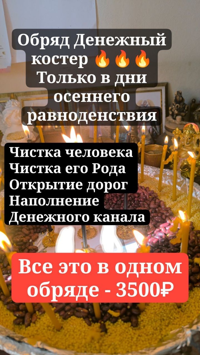 🔥 Денежный костер 🔥 21 сентября, в самый пик набора энергии осеннего равновесия, проведу большую групповую работу Комплекс работ включает в себя: - Чистку вашего энергополя - Чистку вашего Рода - Открытие дорог - если вы чувствуете, что буксуете и все застопорилось, значит пора расчистить завалы к вашей мечте и реализации - Наполнение Денежного канала - чтобы приход денег был стабильным, постоянным, а не хаотичным из раза в раз, чтобы доход рос быстрее Стоимость комплексного обряда - 3500₽ Запись на обряд Денежный костер объявляю открытой! Успевайте активировать свои денежные возможности в энергиях магических сильных дней! Запись в лс @JenyaDob