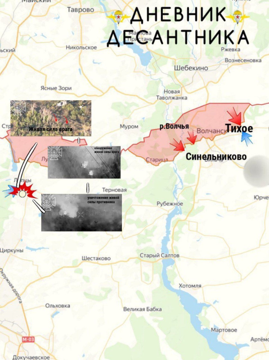 🪖 Харьковское направление На данном направлении в нескольких районах продолжаются ожесточенные бои. Противник постоянно перебрасывает подкрепление и пытается контратаковать, но ему мешают расчеты наших ТОС и артиллерия. Слаженная работа ВС РФ не даёт врагу осуществить свои планы. Волчанский и Липцовский участки 🪖 Мы продолжаем расширять плацдарм на левобережье Волчанска, постоянно продвигаясь в этот раз ещё на 200 м. Кроме того, на востоке города в р-не н.п Тихое также имеем продвижение несмотря на тяжесть боев. 🪖 Возле Синельниково в лесах отражаем атаки ВСУ и продолжаем продвигаться в глубь. 🪖 На участке в р-не н.п Липцы особых изменений нет, но работает наша разведка выявляя живую силу врага в лесополосах. По противнику работают наши расчеты FPV-дронов и сбросы ВОГов. Великобурлукский участок На данном участке фронта от н.п Меловое до н.п Хатнее продолжаем продвижение и гасим сопротивление врага. Потери противника 🪖 Волчанский и Липцовский участки: 💥 1 орудие м-56; 💥