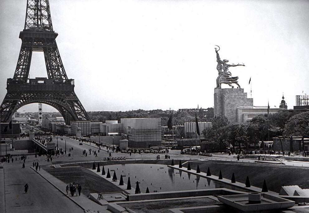 Знаменитая скульптура «Рабочий и Колхозница», в Большой советской энциклопедии названа "эталоном социалистического реализма", была изготовлена в 1935-1937 годах для советского павильона на Всемирной выставке в Париже, который и был открыт там 25 мая 1937 года. Она была создана знаменитым советским скульптором Верой Мухиной и архитектором Борисом Иофаном. Скульптурная группа из двух фигур, поднявших над головами, серп и молот, изготовлена из нержавеющей хромоникелевой стали. Ее высота от подножия до вершины серпа - 24 м. Рост рабочего - 17,25 м, рост колхозницы - 10 м. Общий вес - 80 тонн.