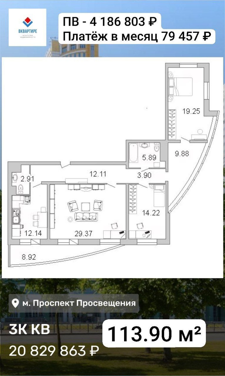 Кейс 🔑 3К КВ, Выборгский р-н Ⓜ️ Проспект Просвещения, 20 минут пешком 😊 Расчёт стоимости по семейной ипотеке от застройщика: Стоимость квартиры с удорожанием - 20 829 864 ₽💰 ПВ - 4 186 803 ₽💳 Платёж в месяц 79 457 ₽📌 Ставка - 4%📈 Срок, лет - 30✨ Преимущества: 👍 Шаговая доступность до метро (20 мин до ст.м.пр.Просвещения) Рядом есть все необходимые объекты социальной инфраструктуры: детские сады, школы, поликлиники.🎯 Жильцы ЖК обладают эксклюзивным доступом в торгово-развлекательный центр 🏠 Во дворе дома планируется школа и детский сад 🚶🏫 Физкультурно-оздоровительный комплекс внутри ЖК ⛹️♀ Описание объекта: Проект жилого комплекса, реализуемый в Выборгском районе Петербурга, считается одним из наиболее масштабных проектов строительства жилья в городе. На территории ЖК обещают разместить живописный парк, который раскинется на площади 5 гектаров. Здесь же оборудуют детские площадки, клумбы, фонтаны и бассейны. Согласно проекту, вся территория комплекса будет закрытой и н