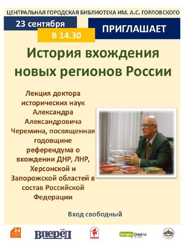 Город Сергиев Посад, центральная городская библиотека им.А.С. Горловского. 23 сентября в 14:30 Тема лекции «История вхождения новых регионов России» На лекции будет рассказано об истории земель юга России и возвращении части русской территории в Российскую Федерацию.