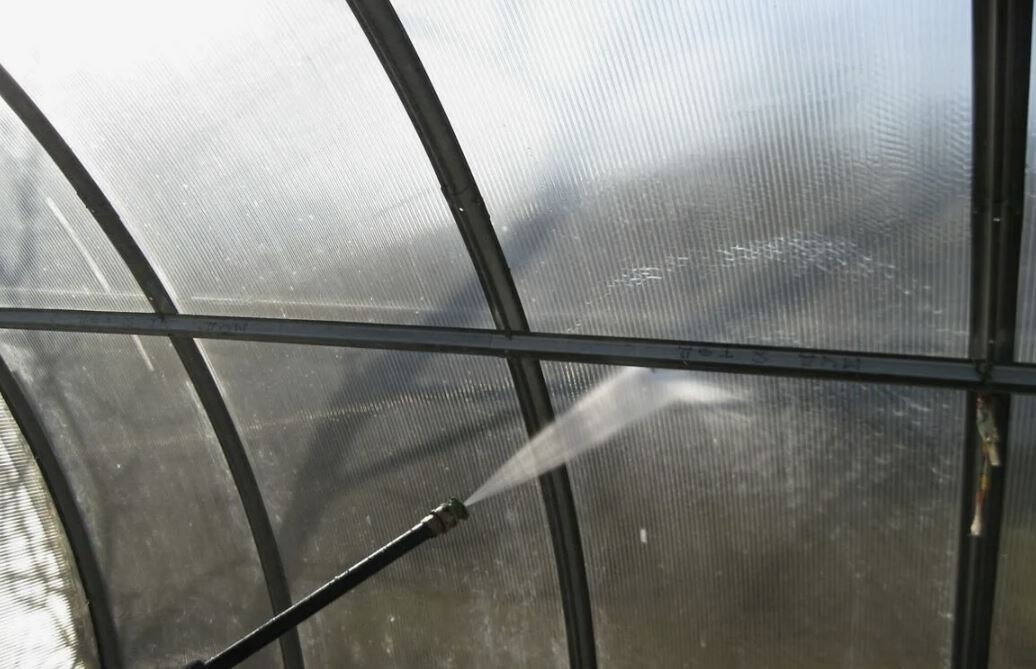 - Стёкла, поликарбонат, рамы и двери — протираем горячей водой с хозяйственным мылом.