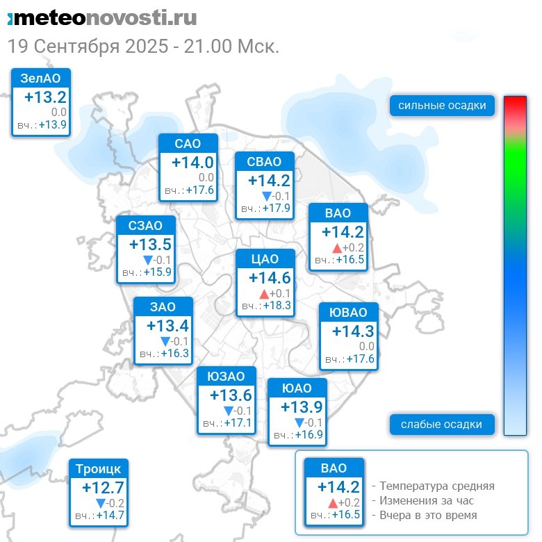 В 21:00 в Москве было от +12.6°C до +14.8°C, средняя температура +13.9°C #погода #Москва #осень #температура #19сентября #пятница Перейти на сайт Прогноз погоды на 14 дней