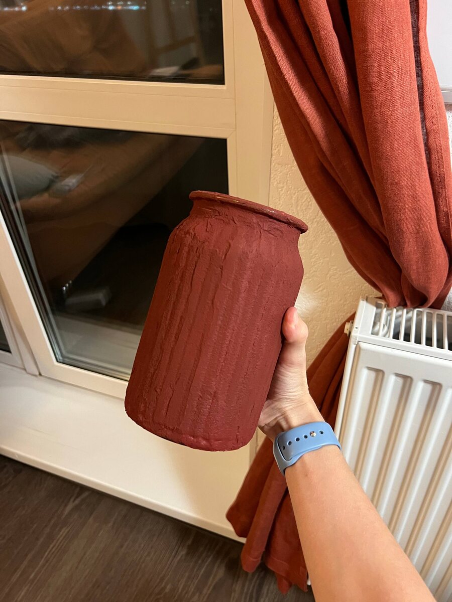 Оставшимся цементом я решила покрыть вазу🪷 Долго думала, куда применить: подошла бы рамки или небольшое зеркало, но ничего подобного дома у нас нет, я уж было взялась за маленькую квадратную полку, как в этот момент мой глаз упал на ту самую. Занятие не совсем простое, так как удобнее в работе плоская поверхность. Я ещё хотела прилепить камушки, которые мне подарили на курсе, но они по цементу стекали вниз. Думаю, когда ваза высохнет, можно будет ее отшкурить (или нет), покрыть лаком (или нет), а то частички сыпятся и уже потом обклеить камнями. А можно вообще попробовать сделать поверхность ровной, если хватит цемента (что вряд ли)