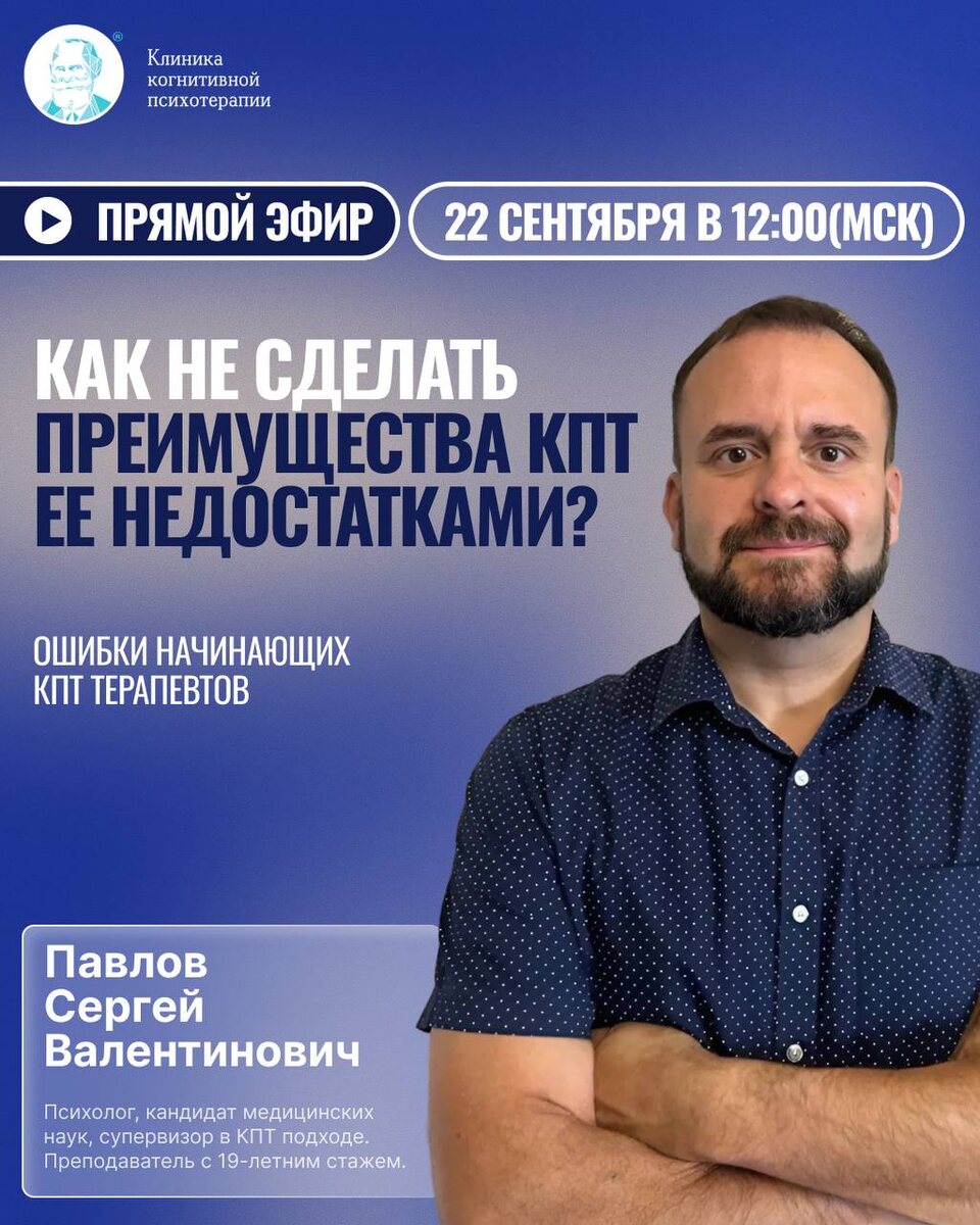 ПРЯМОЙ ЭФИР «Как не сделать преимущество КПТ её недостатками? Ошибки начинающих КПТ-терапевтов» 🗓 Дата: 22 сентября ⏰ Время: 12:00 (мск) Сергей Валентинович Павлов — опытный психотерапевт и преподаватель, который умеет объяснять сложное простым языком и всегда делится практикой, проверенной годами работы 👉 Зачем вам быть на эфире: вы узнаете самые частые ошибки начинающих специалистов в КПТ — и поймёте, как их избежать в своей работе; разберётесь, как сильные стороны метода могут обернуться ограничениями, и научитесь использовать КПТ гибко, а не шаблонно; получите практические советы и алгоритмы, которые помогут сделать ваши сессии более результативными и точными; сможете задать вопросы эксперту и получить живой отклик на ваши профессиональные ситуации 🔥 Эфир — это возможность заранее познакомиться со стилем преподавания Сергея Валентиновича и убедиться, почему его курс по КПТ (стартует 11 октября в CBT Clinic Education) называют одним из самых сильных в России Чуть позже о