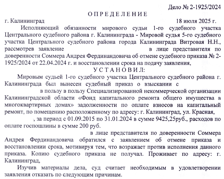 22 апреля 2024 года мировым судьёй 1-го судебного участка Центрального судебного района города Калининграда был вынесен судебный приказ №2-1925/2024, по которому мой клиент внезапно оказался должником. Изучая материалы данного дела, я установил, что судебный приказ был вынесен в связи с наличием задолженности по оплате взносов на капитальный ремонт. Взыскатель в своём заявлении просил произвести взыскание с собственника жилого помещения по адресу г. Калининград, ул. Чкалова, д. 16, кв. 2. «Должник» к указанной квартире не имеет никакого отношения, никогда не был зарегистрирован по этому адресу, никогда там не проживал и не владел данной недвижимостью. Разумеется, в материалах дела отсутствуют какие-либо документы, подтверждающие связь моего клиента с этим адресом. Как так вышло - пока остаётся загадкой. А в вынесенном судебном приказе, оказывается, взыскана задолженность по уплате взносов на капремонт по месту регистрации и проживания моего клиента, что вообще непонятно – выходит, суде