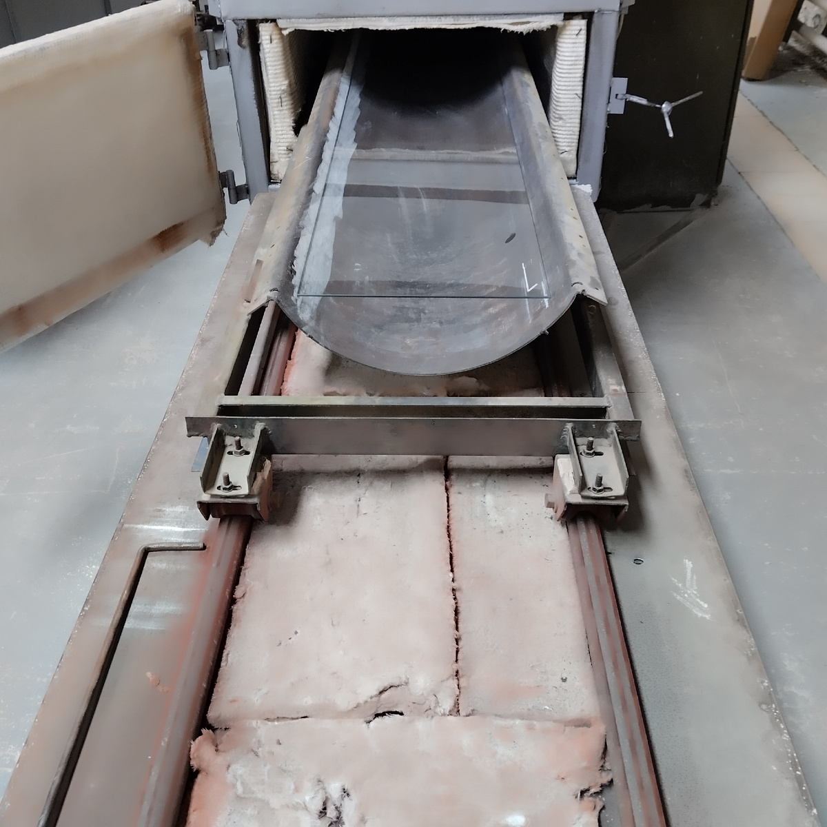 Плоское листовое стекло укладывается на металлическую форму и помещается в печь. Быстрый нагрев до температуры размягчения, всего то минут десять. И раскалённое стекло плавно, едва касаясь металла оседает на форму. Остывание, недолго, минут двадцать будет достаточно, и вот готовая стеклянная деталь цилиндрической формы. Испытание нового стекла на прочность. Стекло уложено на подставки и нагружено. 20 кирпичей по 4.5 кг, всего 90 кг. Больше кирпичей не было. Стекло получилось термоупрочнённое. Закалённое стекло ещё прочнее, но печь для закалки гораздо сложнее в настройке и эксплуатации.