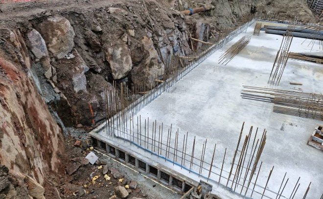 Все это было необходимо, потому что скала мешала возвести фундамент здания. Сейчас он залит, рабочие также поставили колонны, на которых будет построен первый этаж.
