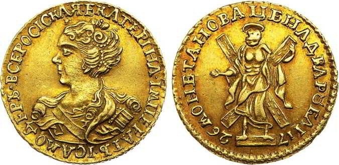Екатерина 1 была женой Петра Великого и так как он не назначил себе прямого наследника, то взошла на престол сразу после его смерти, в 1725. Хотя она правила всего несколько лет (1725-1727), этот период был ознаменован великими достижениями, такими например, как создание Академии наук и проведение морской экспедиции под руководством Беринга. Масштабных изменений на монетном дворе не произошло. Екатерина продолжила начинания своего предшественника. Она продолжила чеканить золотые монеты номиналом в 2 рубля. Для чеканки золотых монет Екатерины 1 использовалось золото 781 пробы. 2 рубля 1726 года Екатерины 1 весили 4.1 грамм. В эти годы продолжалась чеканка монетных номиналов из разных металлов, утвержденных еще при Петре I, из золота серебра и меди. Золотым деньгам в силу нехватки золота в стране отводилась символическая роль и они практически не использовались в широком обращении. Чеканка монет велась на двух монетных дворах. Один из них был расположен в северной столице в Санкт-Петербу